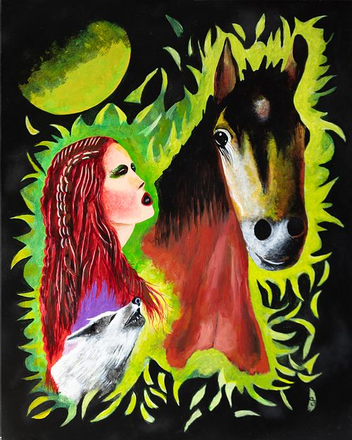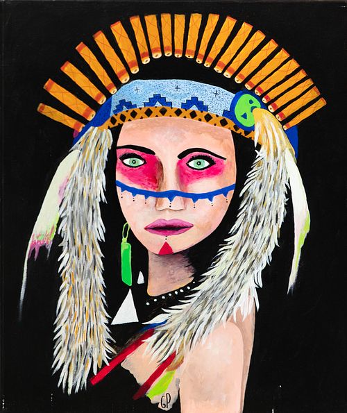 Portrait d’une femme en tenue traditionnelle amérindienne sur fond rouge vif. Elle porte une robe jaune ornée de motifs colorés verts et bordeaux, des perles bleues et tient une grande plume d’aigle. Au-dessus d’elle flotte un motif d’oiseau stylisé aux tons dorés, et un bouclier bleu décoré avec un aigle apparaît dans la partie inférieure. L’œuvre combine des éléments traditionnels amérindiens avec un style de peinture contemporain.